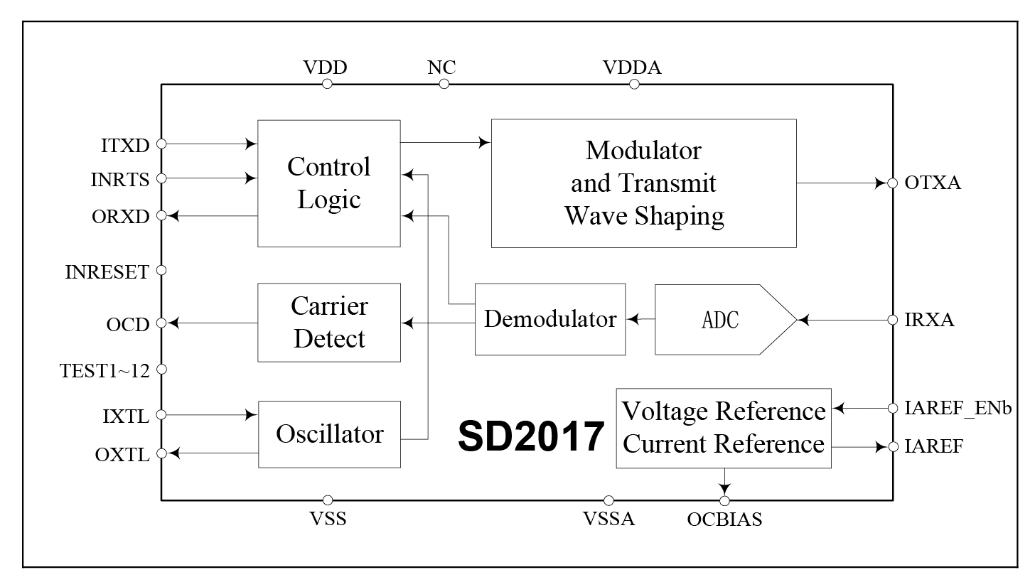 The SD2017 is a CMOS single chip modem IC used in Highway Addressable Remote Transducer (HART) field instruments and masters. This IC together with a few external passive components provide all functions needed to satisfy HART physical layer requirements including modulation, demodulation, receive filtering, carrier detect, and transmit signal wave shaping.