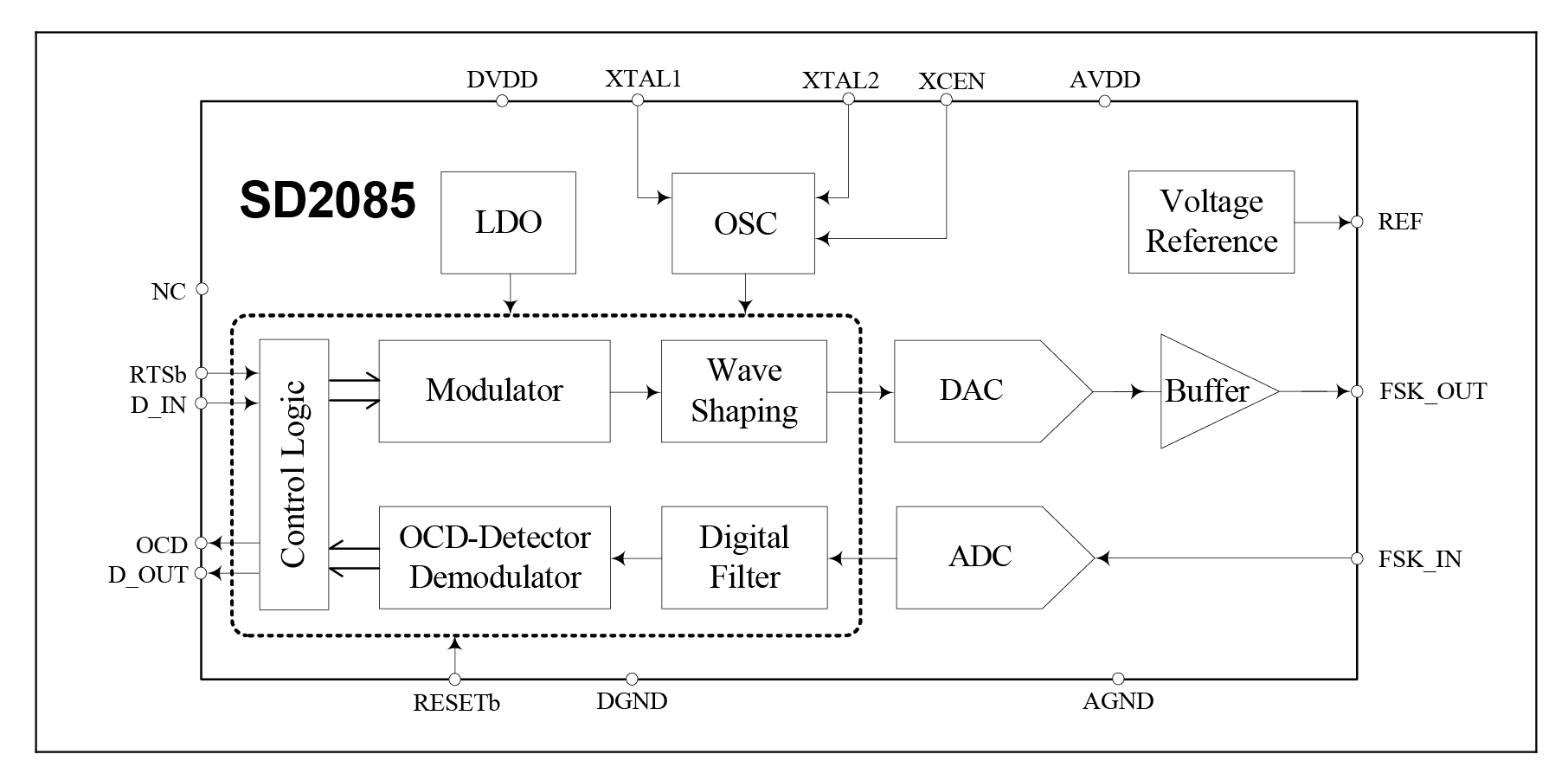 The SD2085 uses phase continuous Frequency Shift Keying (FSK) at 1200 bps, and operates in half duplex mode per HART protocol. The maximum supply current consumption in transmit mode is 85μA while using 3.6864MHz external Clock source input and 3.6V power supply.