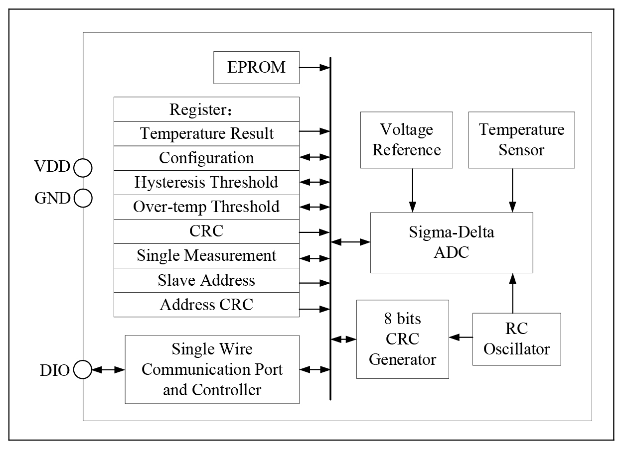 SD5020 is a highly accurate temperature measurement IC. It supports single wire bus communication and outputs 12 bits temperature readings. The typical error is ±0.5℃ for the -10~+85℃ range, and ±0.8℃ for the -55~+125℃ range. Over-temperature alarm thresholds and hysteresis can be set through internal register.