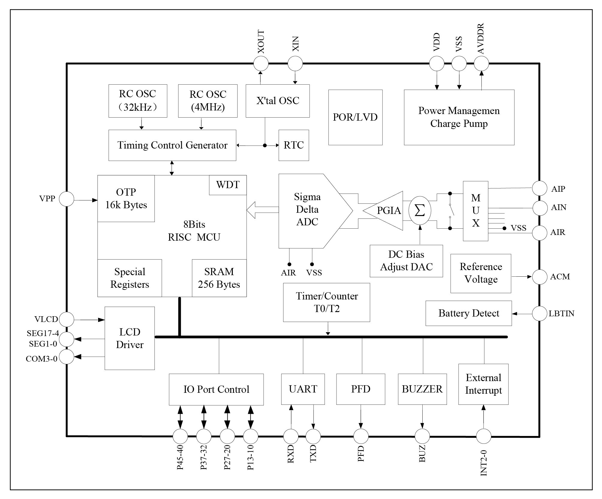 16SEG X 4COM LCD drive, ultra-low power consumption and large drive capability design; programmable boost module to maintain luminance at low supply voltage