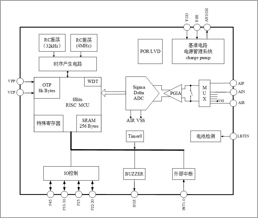 本芯片是带20位ADC的SoC产品,程序存储器为8k Bytes OTP,可以低压自烧录,烧录电压范围:2.4~3.6V,用于替代外部EEPROM。非常适合带LED显示的人体秤等家用秤应用。