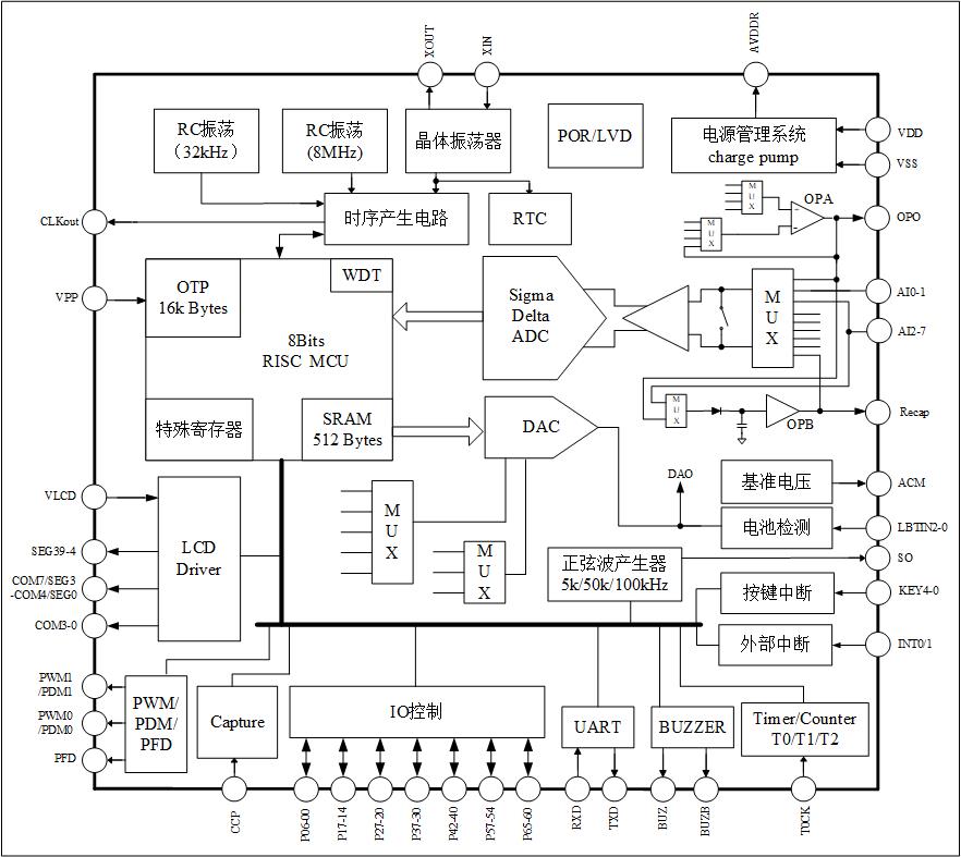 8位RISC超低功耗MCU,49条指令,6级堆栈,在2MHz工作时钟,MCU部分在3V 工作电压下电流典型值为400μA; 32kHz时钟待机模式下工作电流1.5μA,休眠模 式电流小于1μA
