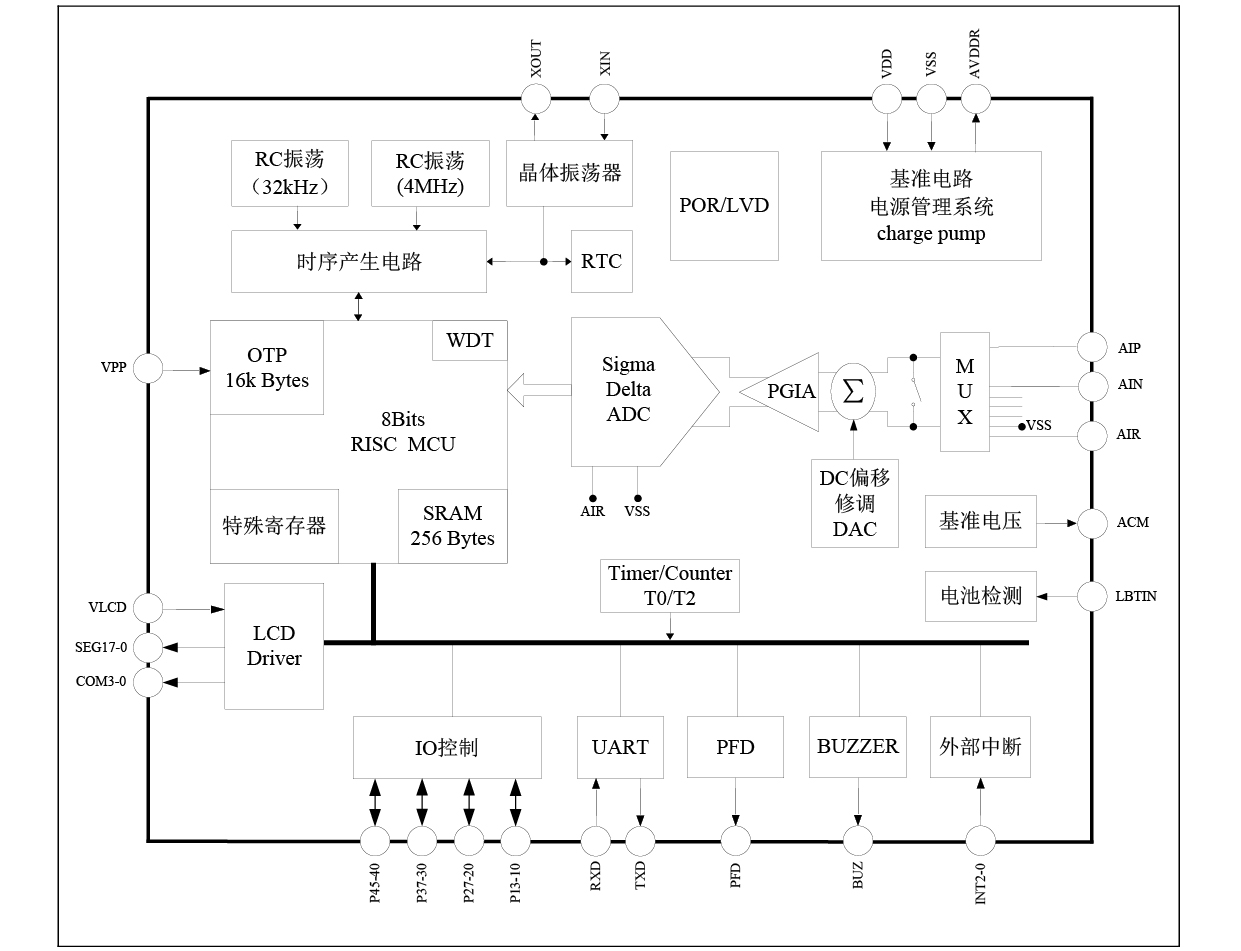本芯片是带 20 位 ADC 的 SoC 产品, 程序存储器为 16k Bytes OTP,可以低压自烧录, 烧录电压范围: 2.4V ~ 3.6V, 用于替代外部EEPROM。 外围只需要 5 个电容,器件很少,非常适合人体秤等家用秤应用。