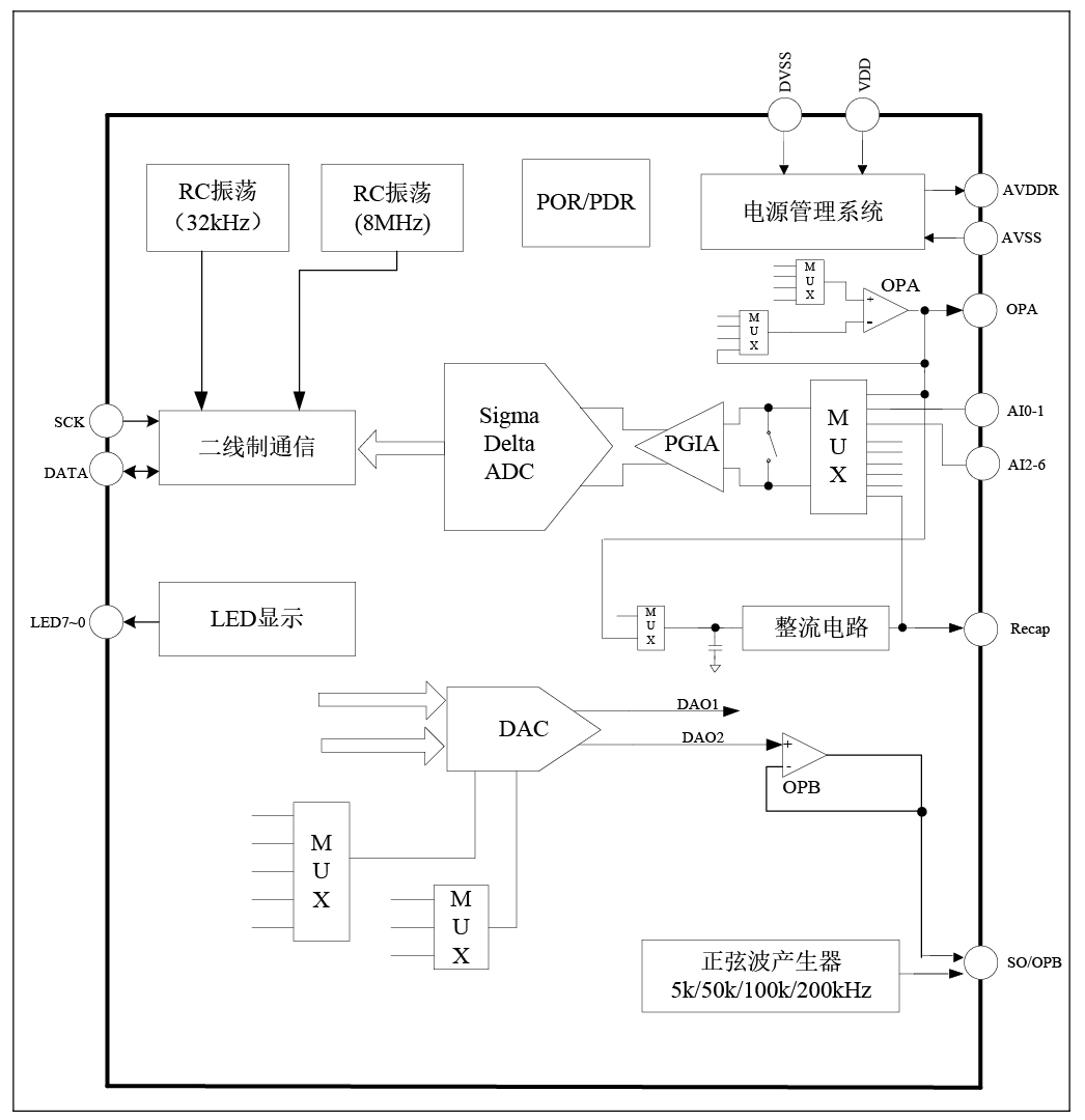 本芯片内置24位ADC、LED驱动、两线制通信等电路。