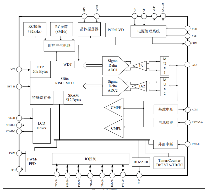 8位RISC超低功耗MCU,49条指令,6级堆栈,在2MHz工作时钟,MCU部分在3.3V工作电 压下电流典型值为400μA;32kHz时钟待机模式下工作电流1.5μA,休眠模式电流小于1μA