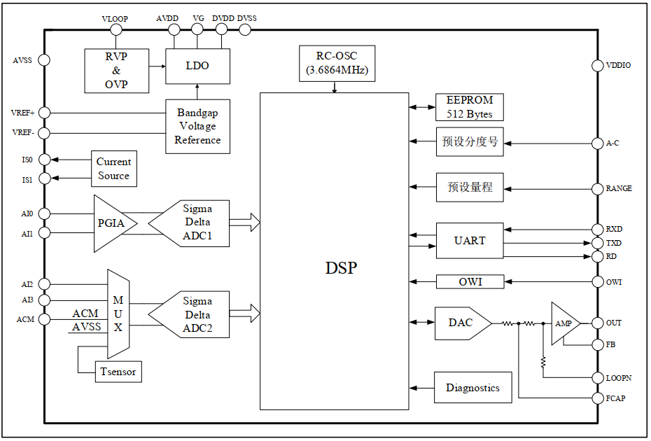 SD23M101T高度集成,用于温度传感器,包括PT100/PT1000/Cu50/Cu100/K/E/S/B/J/T/R/N。片内集成高压电源模块,24位主信号测量ADC,24位冷端温度测量ADC,仪表放大器,恒流源,恒压源,支持OWI通信,非常适合工业现场仪表应用。高度集成,使用很少的外围器件,即可实现方案功能,且调试工作简单。热电偶应用支持外部NTC做冷端补偿,可有效提高热电偶测量精度。支持预设量程、预设传感器类型选择。支持RS485通信,集成组态、校准等功能。